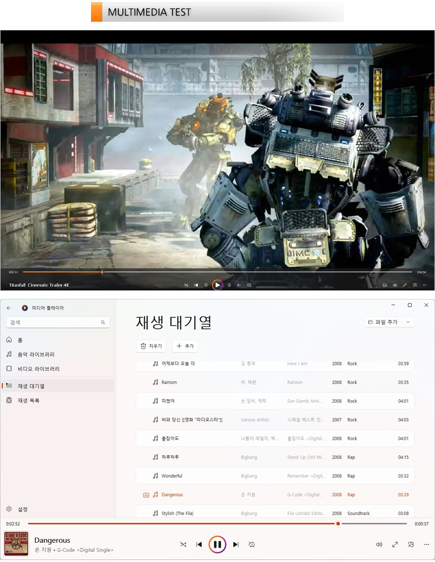 또한 MP3 파일을 이용해 내장 스피커의 사운드를 확인해 보았는데 사무실을 가득 울리는 시원한 소리를 들려 주었다. 특히 스피커가 바닥면을 때려 약간 먹먹한 소리를 들려주는 일반 노트북들과 달리 키보드 측면에서 바로 소리가 전달되어 카랑카랑한 사운드를 즐길 수 있었다.