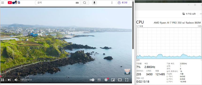 유튜브 고화질 동영상을 이용해 CPU 점유율을 테스트 하고 있는 모습으로 (2160P@60FPS) 6-14% 대의 점유율을 보여 주었으며 인터넷을 실행했을 때 30% 후반까지 점유율이 올라가는 것을 확인할 수 있었다.