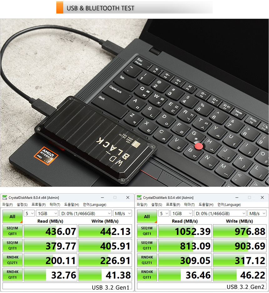 2개의 USB 4 단자를 지원해 빠른 데이터 전송이 가능하다. 상단의 사진은 외장 SSD를 이용해 USB 3.2 Gen1 단자와 비교한 모습으로 약 2배 정도 빠른 속도를 보여주었다.