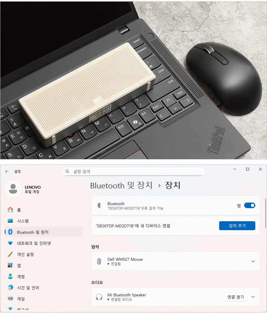 블루투스를 지원해 무선으로 주변기기를 연결해 사용할 수 있다. 상단의 사진은 마우스와 스피커를 연결한 모습으로 정상적으로 페어링 되는 것을 확인할 수 있었다.