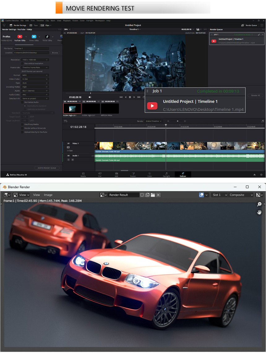 영상편집 S/W 다빈치 리졸브를 이용해 랜더링 테스트를 진행하고 있는 모습으로 (640MB, 920MB, 990MB 4K 동영상을 단일 동영상으로 랜더링, FHD 해상도에 H.264 비디오 코덱) 9분 13초가 소요되는 것을 확인할 수 있었다. 또한 블랜더 랜더링 테스트에서는 2분대의 랜더링 시간을 보여주었다. (내장그래픽 기반이기 때문에 영상편집 랜더링 시간은 길다. 하지만 CPU를 주로 활용하는 블랜더 랜더링 시간은 상당히 빠른 것을 확인할 수 있다.)