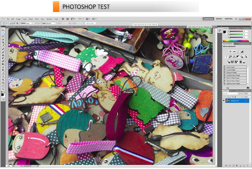 포토샵을 이용해 원본사진 편집 테스트를 진행하고 있는 모습으로 부드럽게 작업할 수 있었다. NTSC 45% 지원 모델로 심플한 사진편집이나 디자인 작업용으로 적합하다. (전문적인 디자인 작업용으로 사용하고 싶다면 고해상도 모니터를 연결하기 바란다.) @ 총 46장의 원본 사진 (총 180MB) 을 로딩하는데 걸리는 시간을 측정했는데 15.5초가 소요되었다.