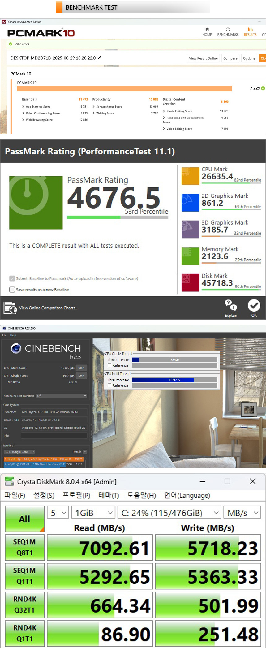 벤치마크 프로그램을 이용해 기기의 성능을 확인하고 있는 모습으로 업무용 S/W 도 부드럽게 실행할 수 있는 높은 스코어를 보여주었다. (8840HS를 탑재한 전작대비 스코어가 높아진 것을 확인할 수 있었다.) 또한 저장장치의 속도를 확인하고 있는 모습으로 PCIe Gen4 SSD가 기본 장착되어 빠른 속도를 보여주었다.