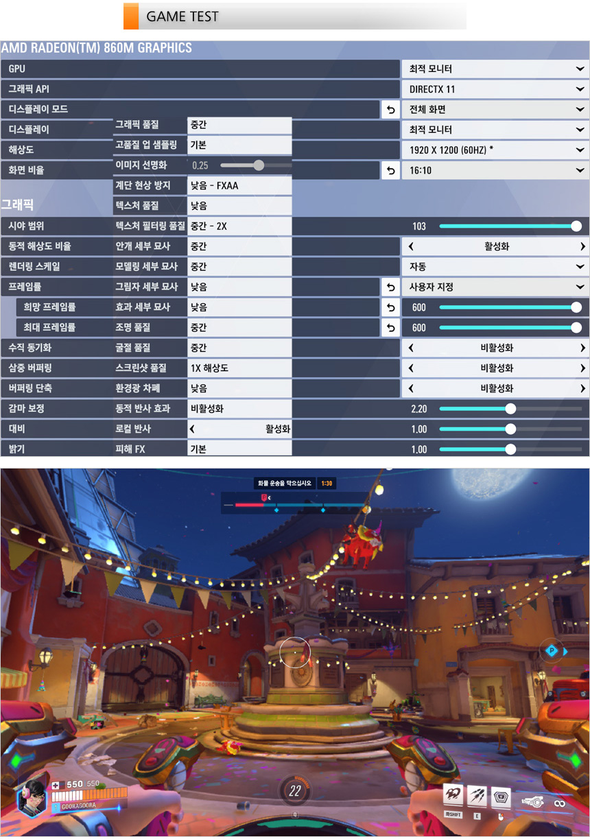 게임 테스트를 진행하고 있는 모습으로 오버워치 2를 중간 옵션에서 플레이 했을때 89-131 프레임을 보여주었다. 부드럽게 게임을 플레이 할 수 있을 것이다.