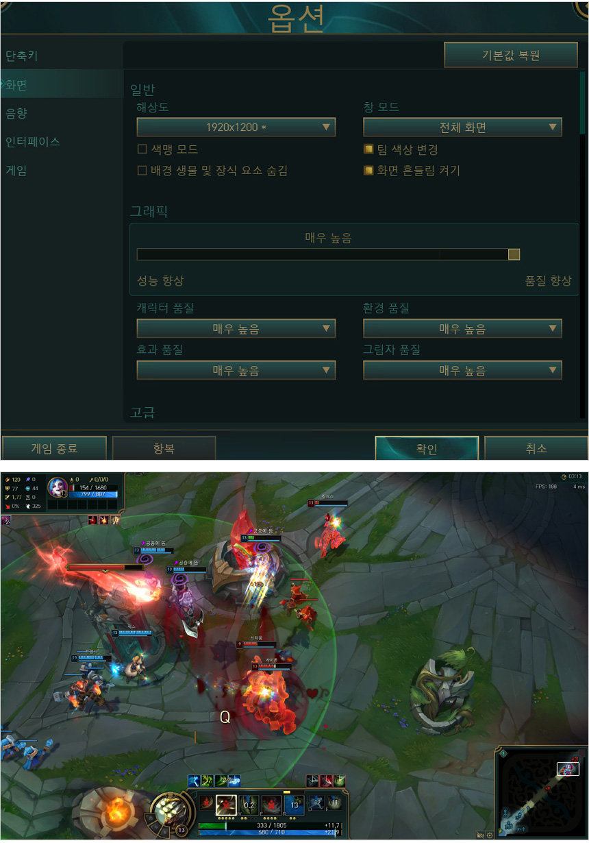 LOL을 매우 높음 옵션에서 플레이 하고 있는 모습으로 (연습 모드) 145-213 프레임을 보여주어 쾌적하게 게임을 즐길 수 있었다. 멀티 게임도 원활하게 플레이 할 수 있을 것이다.