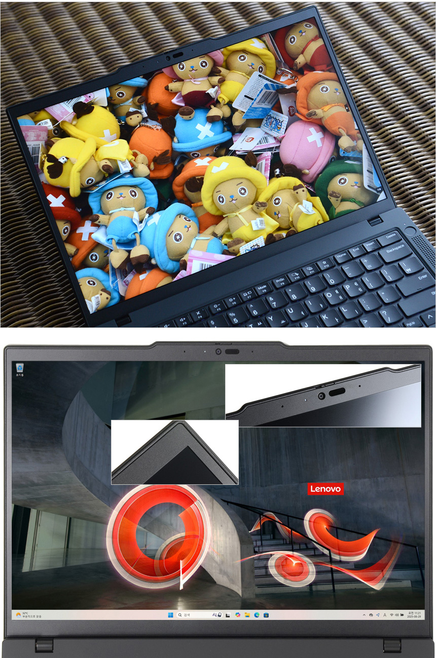 안티 글래어 방식을 적용해 자연광이 비추는 장소에서도 눈의 피로를 줄일 수 있으며 테두리 부분에 두꺼운 디스플레이 범퍼가 설치되어 충격등으로 인한 패널 파손을 미연에 방지한다. 또한 슬림 베젤이 적용되어 높은 몰입감을 경험할 수 있으며 상단 중앙에는 5MP 웹캠과 마이크가 장착되어 화상 회의 용도로 활용하거나 사진 및 동영상 촬영을 할 수 있다.