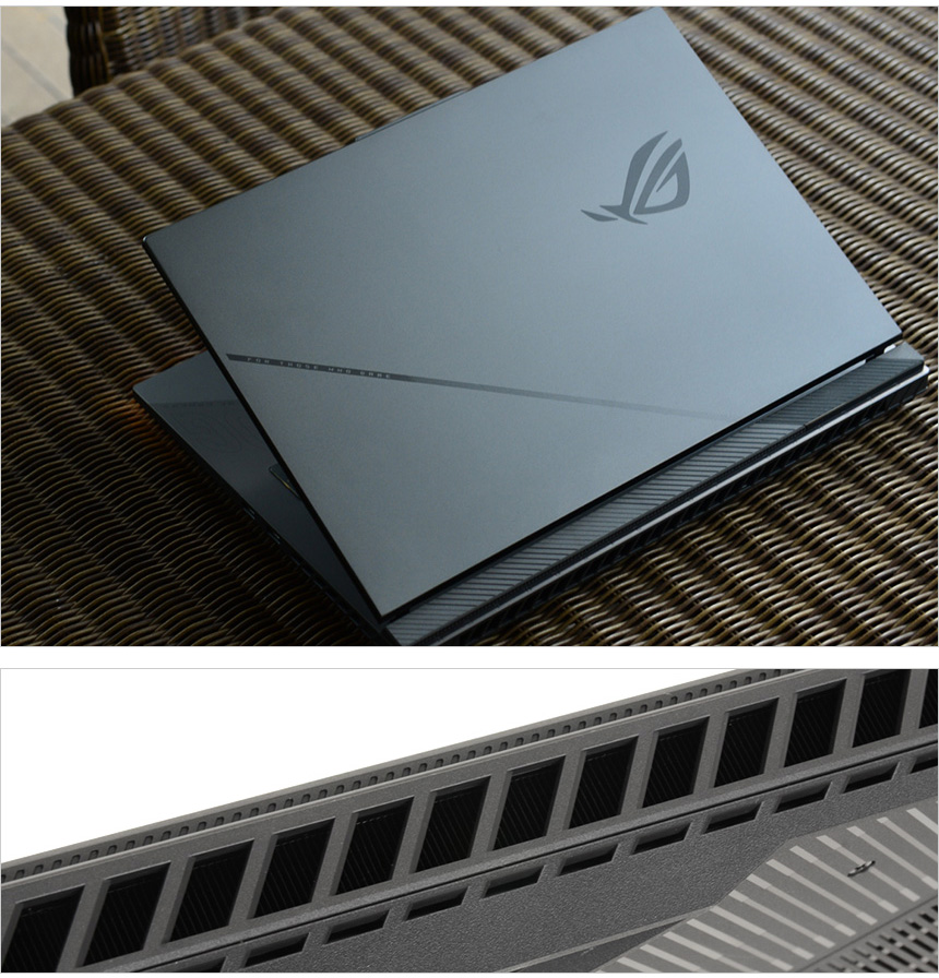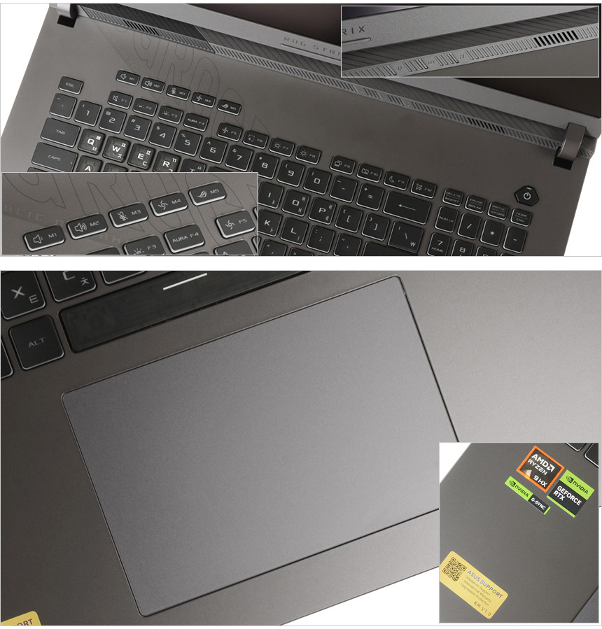 키보드 상단에는 볼륨과 마이크 음소거, ROG Armory Crate 실행버튼이 설치되어 있으며 커스트마이징을 지원해 사용자에 맞게 기능을 설정할 수 있다. 또한 상태확인을 위한 인디케이터와 통풍구 등이 설치되어 있고 팜래스트 중앙에는 대형 터치패드가 장착되어 편하게 노트북을 컨트롤 할 수 있다.
