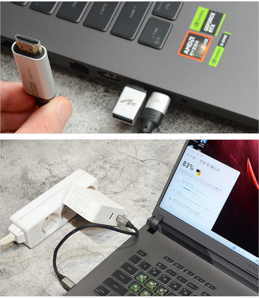 USB 4 단자는 상시전원을 지원해 노트북이 꺼진 상태에서도 스마트폰을 충전할 수 있다. (단, 전원 어댑터는 연결되어 있어야 한다.)