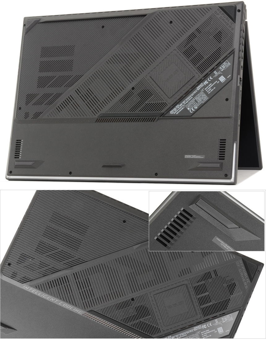 노트북 후면부의 모습으로 뜨거운 공기가 원할하게 빠져 나올수 있도록 통풍구가 설치된 것을 확인할 수 있다. 이 제품은 최고급형 게이밍 노트북으로 최상의 공기 흐름을 위해 풀사운드 통풍구를 적용했으며 0.12mm 의 초박형 구리핀이 배열되어 있고 트라이팬 기술이 적용되어 냉각 효율성을 높였다. 또한 사일런트 모드 지원으로 캐주얼한 작업시 팬소음을 최소화 했으며 먼지가 제품 내부로 들어오는 것을 방지하기 위해 먼지 필터를 적용했다.