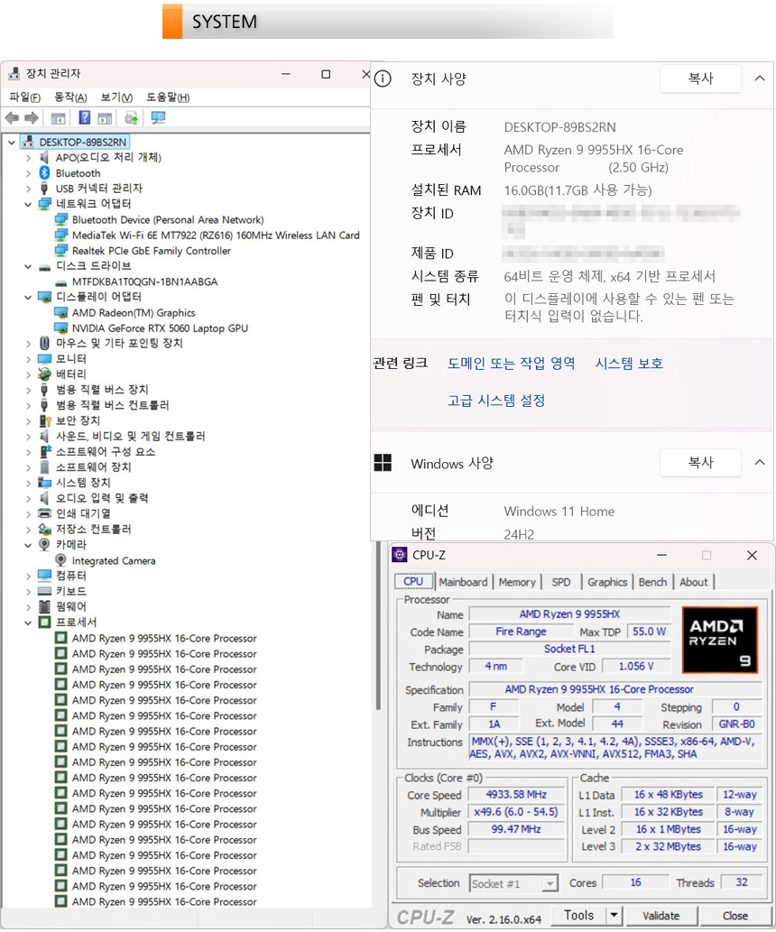 시스템 정보를 확인하고 있는 모습으로 16코어 32스레드에 16+64MB 캐시가 장착된 AMD 라이젠 9 9955HX 프로세서가 장착된 것을 확인할 수 있으며 16GB DDR5 듀얼채널 메모리와 1TB PCIe 4.0 NVMe SSD, 최대 115W TGP와 8GB 비디오 전용램을 지원하는 지포스 RTX 5060 랩탑 GPU가 장착된 것을 알 수 있다. 여기에 Wi-Fi 6E 무선랜카드가 설치되어 고속 무선랜과 블루투스 사용도 가능하며 기가비트 유선랜 지원으로 안정적인 네트워크 환경에서 게임을 즐길 수 있다. 또한 FHD 웹캠이 설치된 것도 확인할 수 있다.