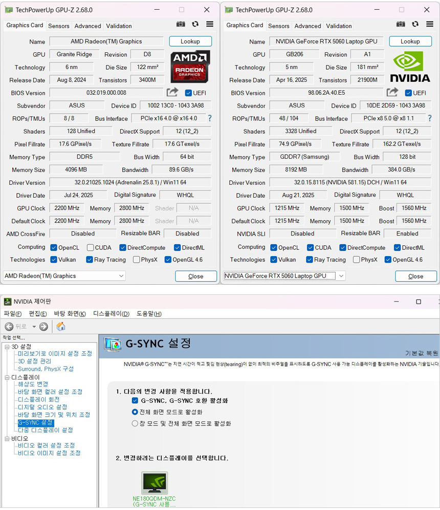 GPU 스펙을 확인하고 있는 모습으로 RTX 5060은 8GB GDDR7 전용램이 제공되며 1560MHz 의 부스트 클럭으로 작동하는 것을 확인할 수 있다. 또한 지싱크 기술이 제공되어 화면 찢어짐 등의 불편없이 게임을 즐길 수 있다.