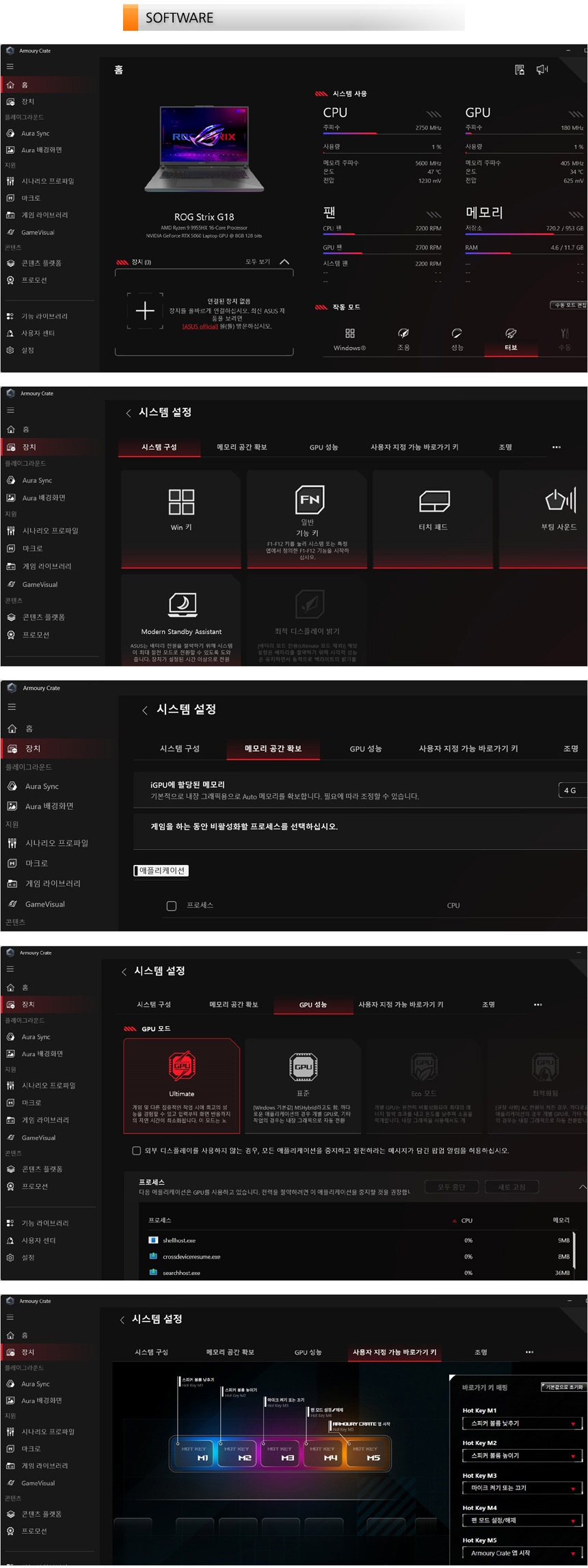 ASUS Armory Crate는 전용키를 제공해 손쉽게 실행할 수 있다. 퍼포먼스 설정을 비롯해 윈도우키 잠금, 터치패드 설정등을 지원해 자신에 맞는 최적의 게이밍 환경을 구성할 수 있으며 MUX 기술이 적용된 노트북으로 내장그래픽의 간섭없이 외장 GPU로만 작동해 성능을 높일 수 있다. 또한 5개의 핫키를 사용자에 맞게 커스트마이징 할 수 있도록 전용 메뉴를 제공한다.