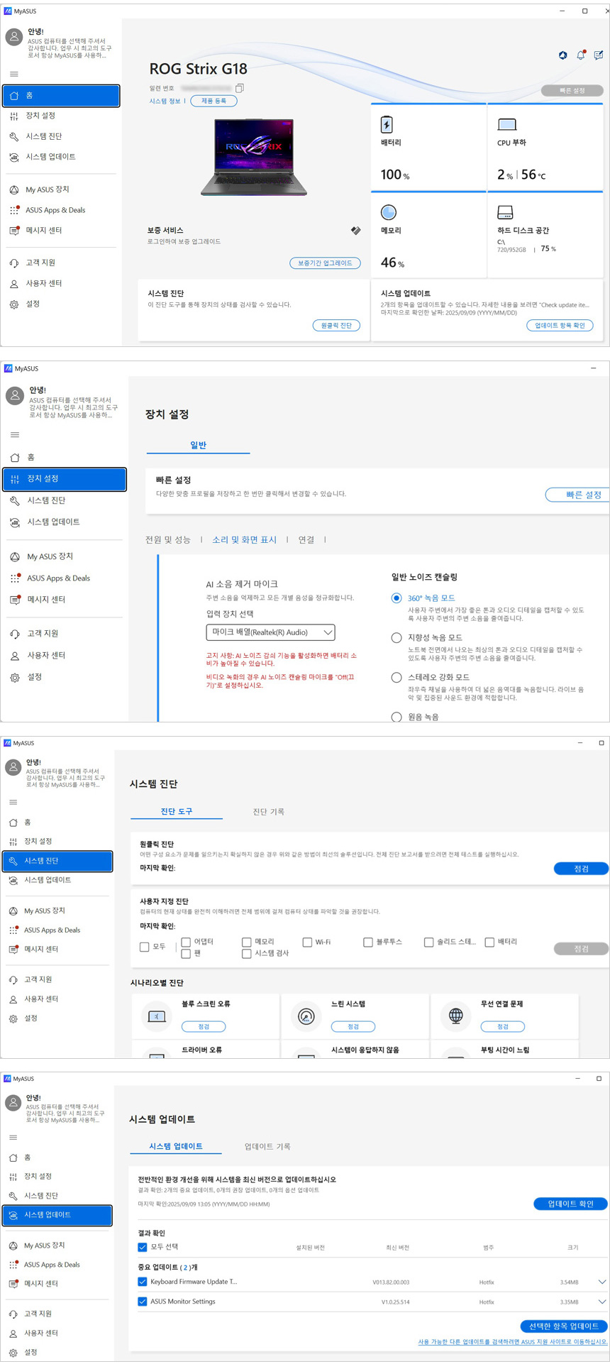 MyASUS 에서는 배터리나 노이즈캔슬링 등의 설정이 가능하며 시스템 검사 기능을 제공해 문제를 손쉽게 파악할 수 있다. 또한 업데이트를 지원해 최상의 컨디션으로 노트북을 사용할 수 있다.