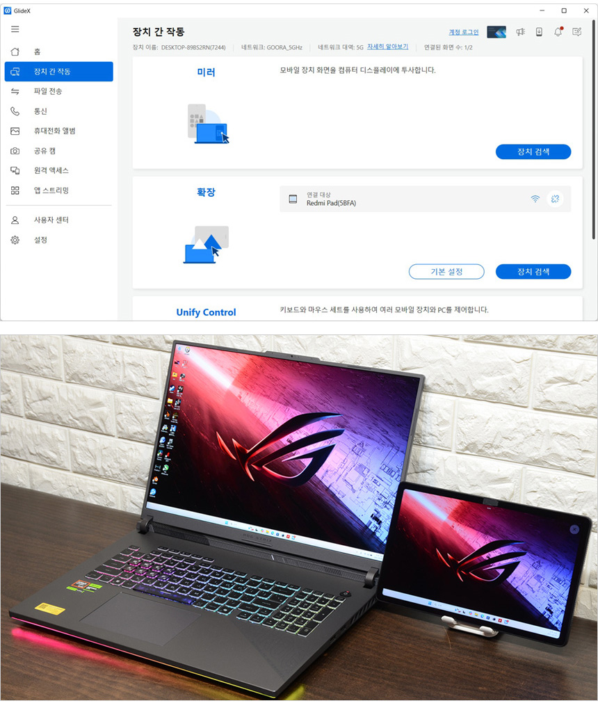 GlideX 앱을 지원해 화면의 복제나 확장, 유니파이 컨트롤이 가능하다. 상단의 사진은 확장 기능을 실행한 모습으로 스마트폰을 확장 모니터로 사용할 수 있었다. 태블릿PC를 사용하면 더 편하게 듀얼모니터로 활용할 수 있을 것이다. (참고로 미러를 선택하면 스마트폰 화면이 노트북에 표시된다.)