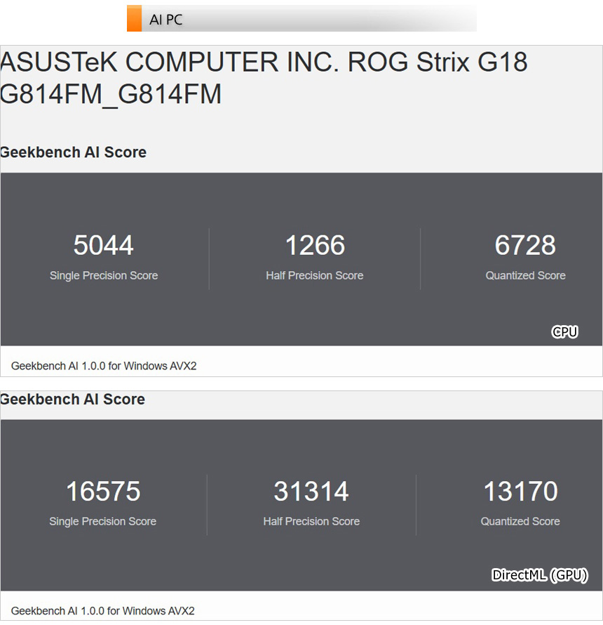 AI 전용 벤치마크 툴을 이용해 AI 성능 테스트를 진행하고 있는 모습으로 최상급 프로세서와 고성능 GPU가 탑재된 모델답게 일반 노트북을 압도하는 높은 스코어를 보여주었다.