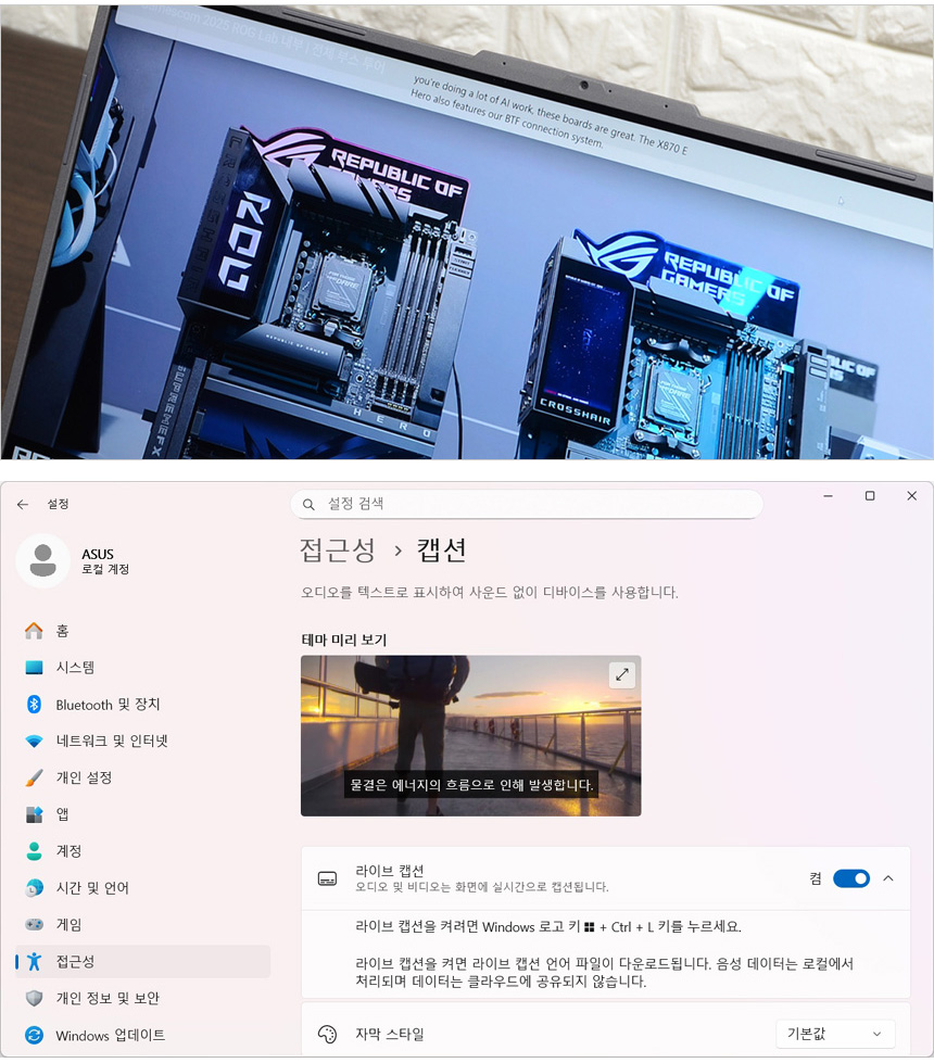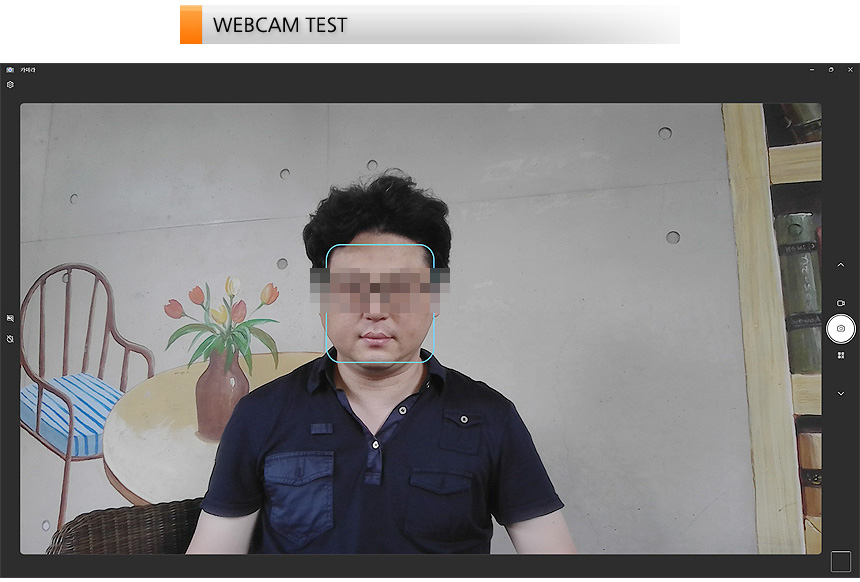 웹캠의 화질을 확인하고 있는 모습으로 FHD 해상도 지원으로 선명도나 디테일이 상당히 뛰어난 것을 확인할 수 있었다. AI 노이즈캔슬링도 지원하는 노트북으로 화상회의나 셀프촬영 등의 용도로 충분히 사용할 수 있을 것이다.