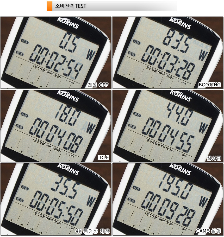 소비전력 테스트를 진행하고 있는 모습으로 (최고성능 모드) 가벼운 작업에서는 50W 내외로 작동했으며 CPU와 GPU가 최고 속도로 동작하는 게임에서는 210W 까지 소비전력이 올라가는 것을 확인할 수 있었다. (게임에 따라 170W~200W로 플레이 되었다. 또한 발열 등으로 인해 소비전력이 떨어지는 현상없이 일정 전력을 수준을 꾸준히 유지했다.)