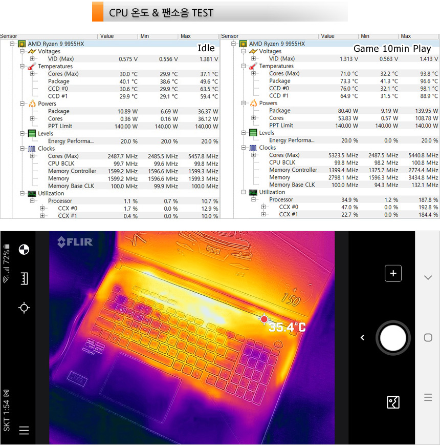 CPU 온도 테스트를 진행하고 있는 모습으로 (최고성능 모드, 실내온도 26도) 아무것도 하지 않는 Idle 상태에서는 30도 초반대로 작동했으며 게임을 10분 정도 실행후 온도를 측정했을 때 70도 중반까지 온도가 올라가는 것을 확인할 수 있었다. (대부분 60도 중반~70도 중반 에서 게임이 플레이 되었다.) 또한 열화상 카메라를 이용해 게임 실행시 열분포를 확인해 보았는데 열이 골고루 퍼지며 고성능 게이밍 노트북임에도 표면 온도가 낮은 것이 눈에 띈다. 특히 팔을 올려두는 팜래스트 부분은 상대적으로 온도가 낮아 게임이나 타이핑시 열로 인한 불쾌감을 느끼지 않을 것이다. (이 제품은 키보드를 시원하게 유지하기 위해 WASD 주변에 작은 통풍구를 설치했다.)
