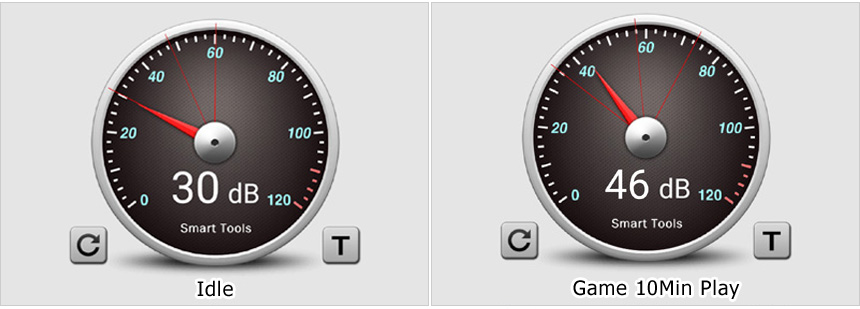 팬소음 테스트를 진행하고 있는 모습으로 (최고 성능 모드) 아이들이나 문서 작업등에서는 팬소음 들리긴 하지만 상당히 작았으며 게임 실행시에는 3개의 팬이 최대로 회전해 소음이 커지는 것을 확인할 수 있었다. @ 측정값은 팬소음이 아니고 팬소음을 포함한 사무실의 생활소음이다. 이점 참조 바란다.