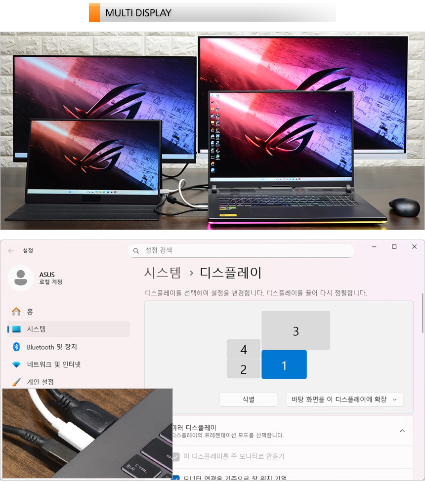 2개의 USB 4 단자가 디스플레이 출력을 지원해 3개의 모니터 연결이 가능하다. 상단의 사진은 모니터를 연결한 모습으로 정상적으로 인식하는 것을 확인할 수 있었다. 성능도 뛰어난 게이밍 노트북으로 4K 모니터 등을 연결해 전문작업용으로 활용할 수 있다.