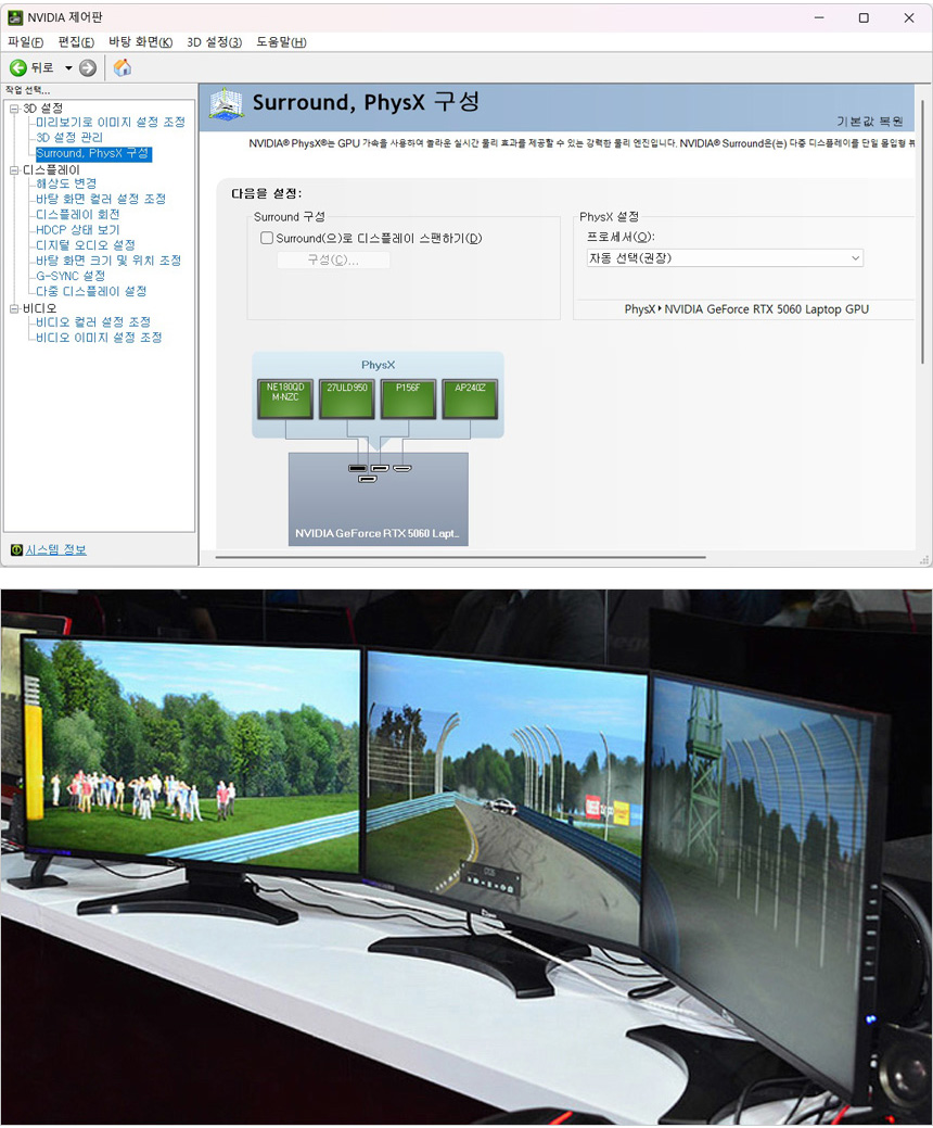 이 제품은 엔비디아 서라운드 기술을 지원해 다중모니터를 한 화면으로 표시할 수 있다. 축구와 같은 스포츠나 레이싱 게임을 즐길 때 유용하게 활용할 수 있는 기술이다. (서라운드 기술 적용시 동일 모니터를 사용하기 바란다.)