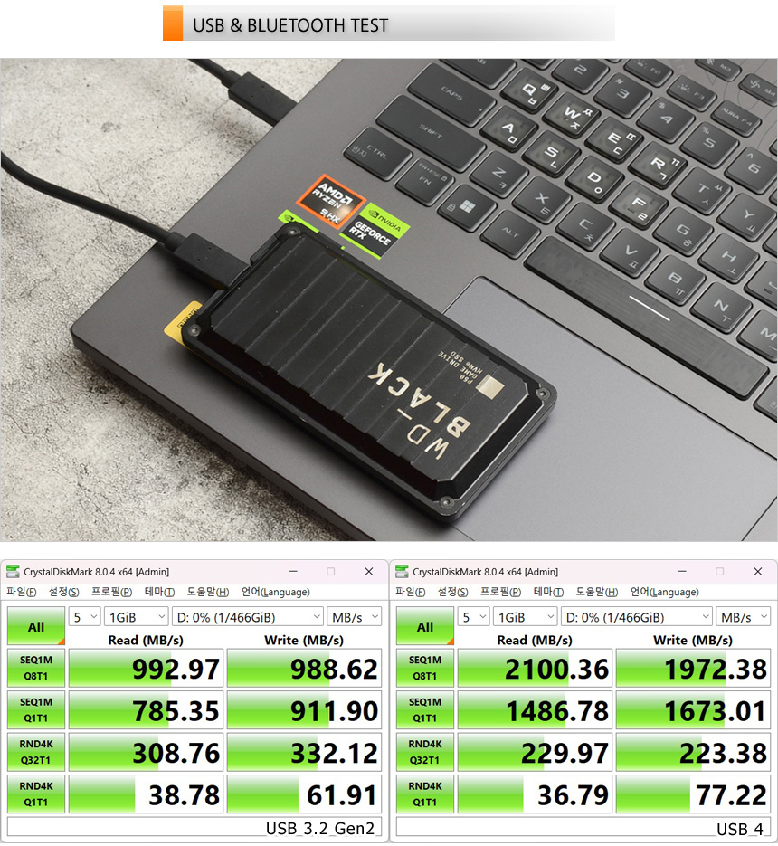 USB 4 단자를 지원해 초고속 데이터 전송이 가능하다. 상단의 사진은 USB 3.2 Gen2x2 지원 외장 SSD를 이용해 테스트를 진행하고 있는 모습으로 USB 3.2 Gen2 와 확연한 속도차를 보여주었다.