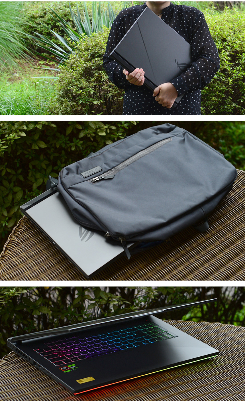 399 x 294 x 23.1~30.8mm의 크기와 3.0Kg 의 무게를 지원한다. 데스크탑 PC수준의 시각적 만족감을 주기위해 18형 대화면 디스플레이를 탑재한 게이밍 노트북으로 크기도 상당하고 무거워 집이나 사무실 등에서 활용하기에 적합하다. 만약 휴대해야 할 경우 반드시 17.3형 이상의 노트북 수납이 가능한 백팩을 구입하기 바란다. 노트북의 디자인은 최고급형 모델답게 상당히 세련된 것을 확인할 수 있다. 키보드와 전면 하단에 RGB LED를 적용해 아름다운 조명 효과를 즐길 수 있으며 중후한 이클립스 그레이 컬러를 적용하고 상판에 ROG 로고를 적용해 포인트를 주었다. 여기에 보급형 노트북과 비교되는 높은 마감 완성도로 고급스러움을 극대화 했다.