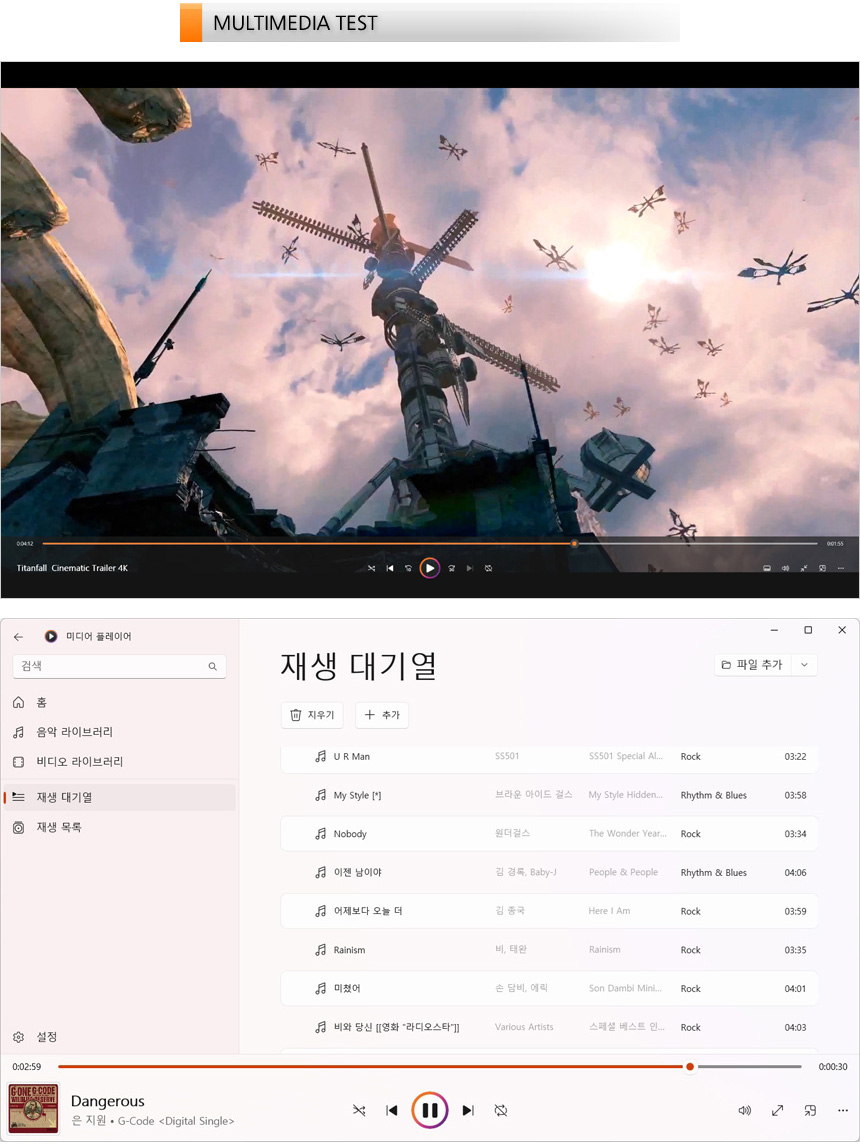4K 동영상을 이용해 멀티미디어 테스트를 진행하고 있는 모습으로 18형 대화면에 슬림 베젤 지원으로 데스크탑PC의 모니터를 보는 듯 시원한 영상을 즐길 수 있었으며 선명도도 매우 뛰어나 몰입감을 높여 주었다. 또한 MP3 파일을 이용해 스피커 테스트를 진행하고 있는 모습으로 돌비 애트모스 지원으로 입체감 넘치는 사운드를 즐길 수 있었다. 특히 소리 자체가 상당히 크고 중고음에 특화된 일반 노트북과 달리 저음까지 재생되어 만족스럽게 음악을 즐길 수 있었다.