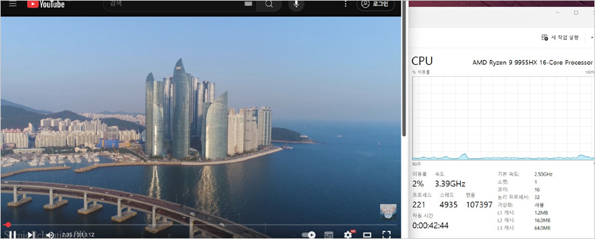 유튜브 고화질 동영상을 이용해 CPU 점유율을 테스트 하고 있는 모습으로 (2160P@60FPS) 2-5% 대의 점유율을 보여주었으며 인터넷을 실행했을 때 10% 후반까지 점유율이 올라가는 것을 확인할 수 있었다.