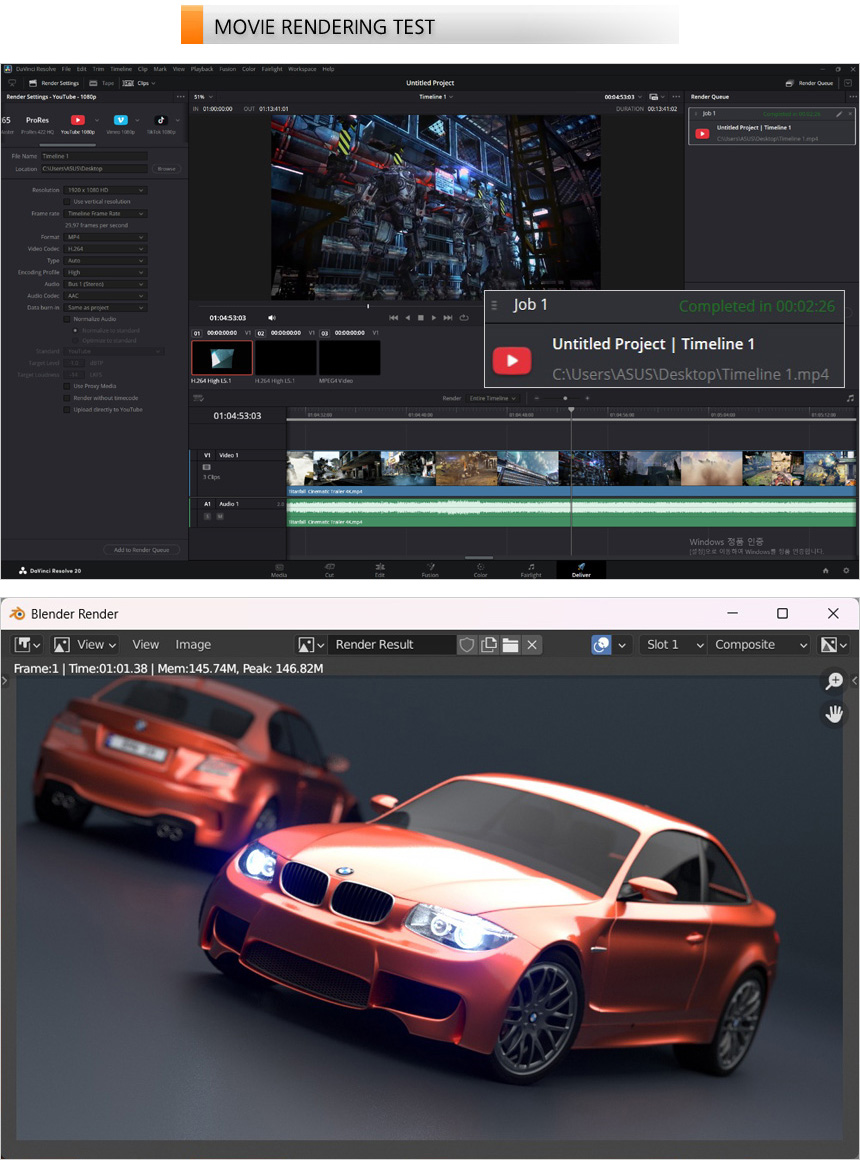 영상편집 S/W 다빈치 리졸브를 이용해 랜더링 테스트를 진행하고 있는 모습으로 (640MB, 920MB, 990MB 4K 동영상을 단일 동영상으로 랜더링, FHD 해상도에 H.264 비디오 코덱) 2분 26초가 소요되는 것을 확인할 수 있었다. 또한 블랜더 랜더링 테스트에서도 1분대의 빠른 랜더링 시간을 보여주었다. @ 영상편집이나 랜더링 등의 작업용 노트북으로 유용하게 활용할 수 있을 것이다.