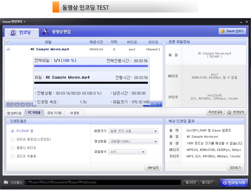 다음 팟인코더를 이용해 4K 동영상의 인코딩 테스트를 진행하고 있는 모습으로 2분 56초의 짧은 인코딩 시간을 보여주었다. (CPU의 강력한 성능을 충분히 체감할 수 있을 것이다.)