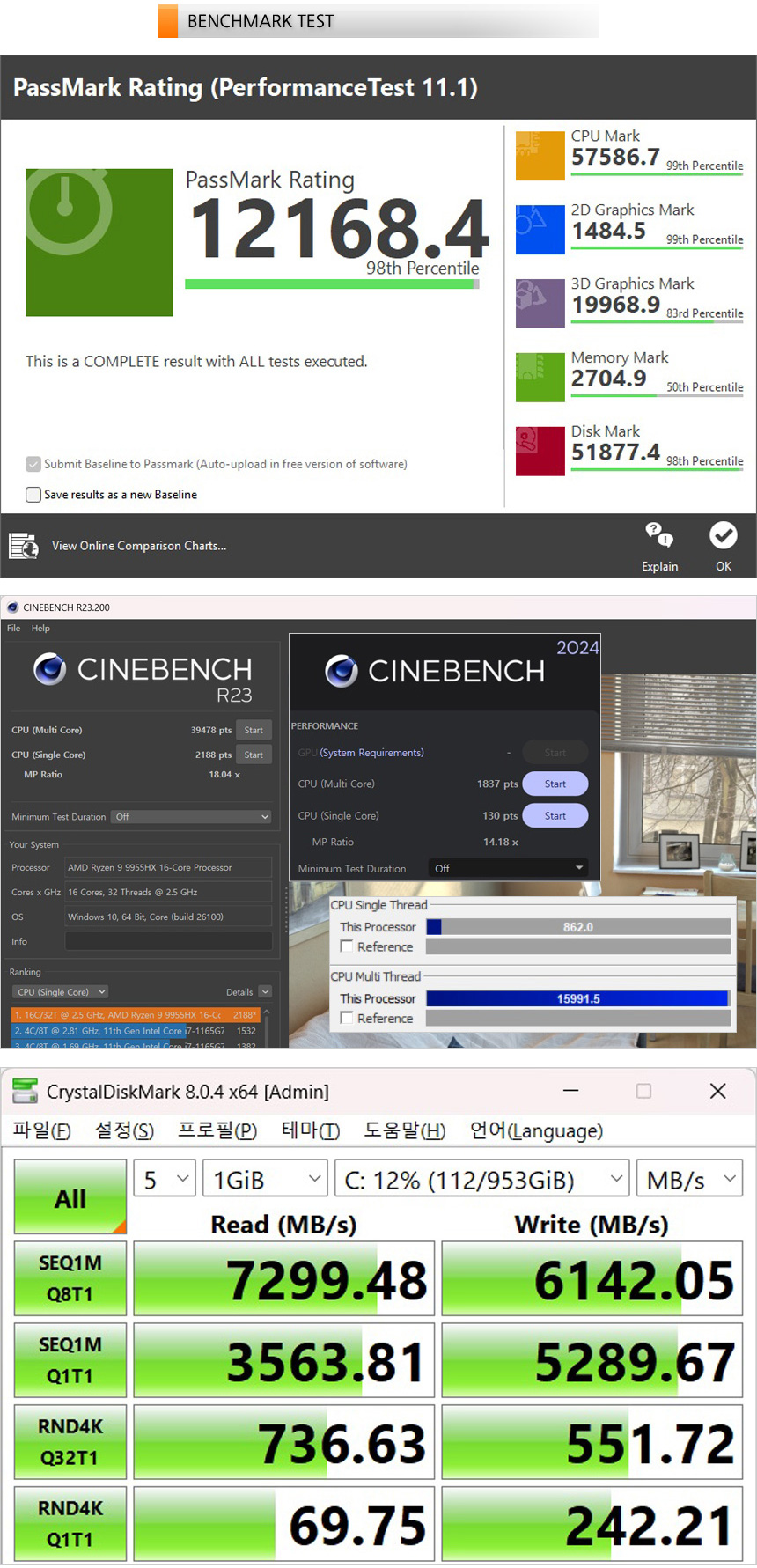 벤치마크 프로그램을 이용해 노트북의 성능을 확인하고 있는 모습으로 일반 노트북에서는 볼 수 없는 엄청난 CPU 스코어를 보여주었다. 어떤 용도로 사용하더라도 성능의 부족함은 느끼지 않을 것이다. 또한 저장장치의 속도를 확인해 보았는데 PCIe 4.0 SSD 탑재 노트북 답게 속도가 대단히 빠른 것을 확인할 수 있었다. 특히 1TB 대용량을 지원하고 여분의 M.2 슬롯이 제공되어 대용량 파일을 여유롭게 저장할 수 있다.