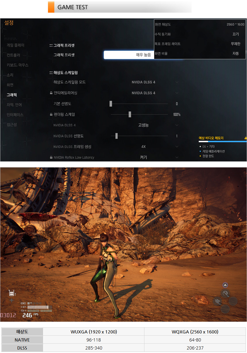 스텔라 블레이드를 플레이 하고 있는 모습으로 DLSS를 활성화 하면 WQXGA 해상도 에서도 200프레임 이상을 확보할 수 있어 부드럽게 게임을 플레이 할 수 있다. (DLSS 의 경우 프레임 생성을 4X로 설정했다.) @ 스텔라 블레이드는 어지럼증이 발생할 수 있는 게임이다. 꼭 DLSS를 확보해 높은 주사율의 장점을 활용하기 바란다.