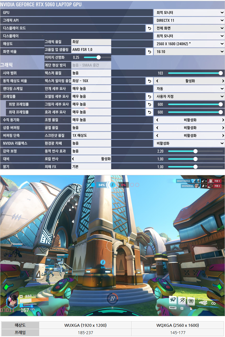 오버워치2를 이용해 게임 테스트를 진행하고 있는 모습으로 최상 옵션을 설정했을 때 WQXGA 해상도 에서도 100프레임 중반대로 게임이 가능하다. 옵션을 낮춰 프레임을 최대로 확보하면 더 부드러운 영상으로 게임을 즐길 수 있을 것이다.