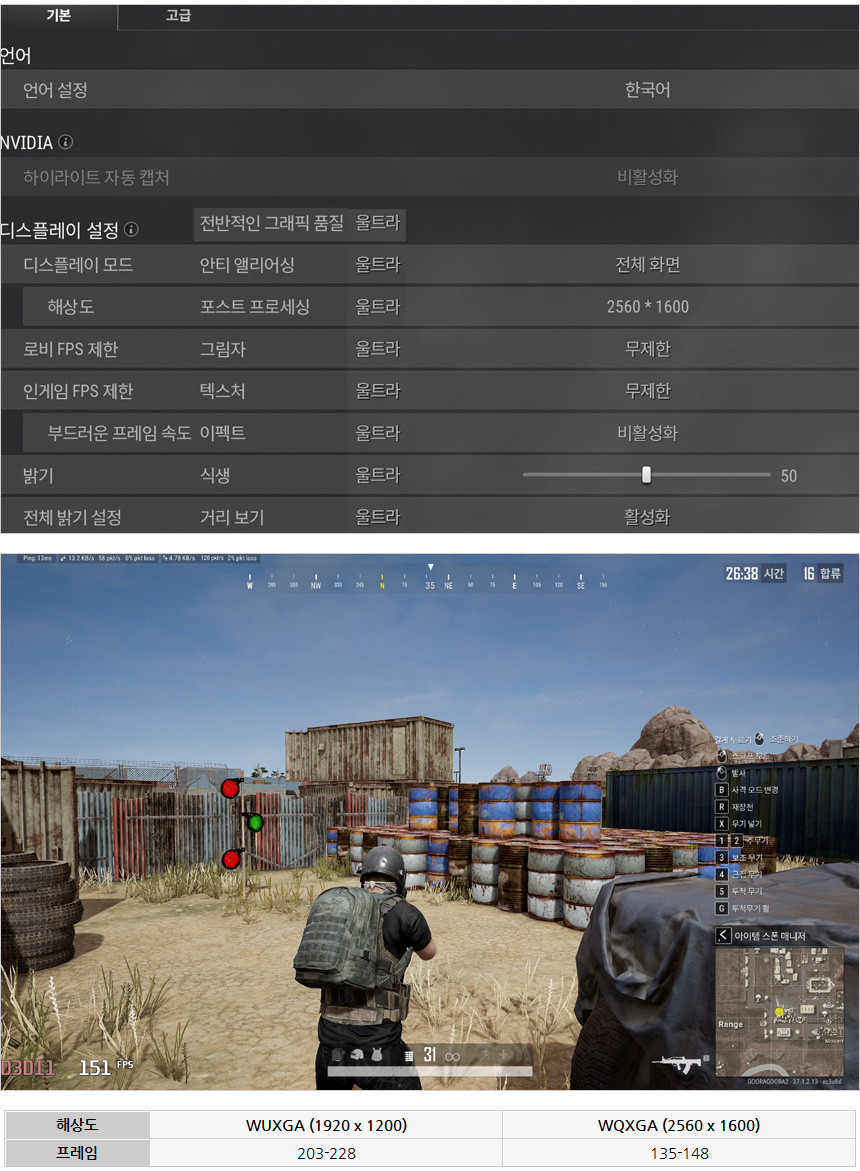 배틀그라운드를 플레이 하고 있는 모습으로 울트라 옵션 설정시 WUXGA 에서는 200프레임 이상으로 플레이가 가능했으며 WQXGA 해상도에서는 100프레임 초중반대로 플레이 되었다. (연습모드에서의 테스트 이다. 실제 게임에서는 프레임의 움직임이 크기 때문에 메모리를 추가해 듀얼채널로 구성하고 옵션을 낮춰 프레임을 더 확보하는 것을 추천한다.)