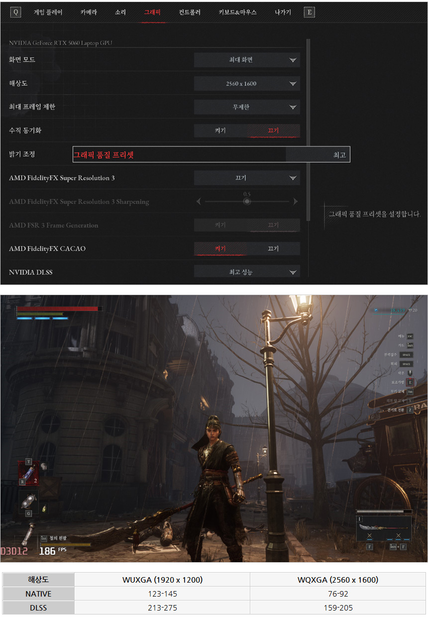 P의 거짓을 최고 옵션에서 플레이 하고 있는 모습으로 DLSS를 지원해 부드럽게 게임을 즐길 수 있었다. (DLSS를 활성화 하면 프레임이 대폭 상승한다.)