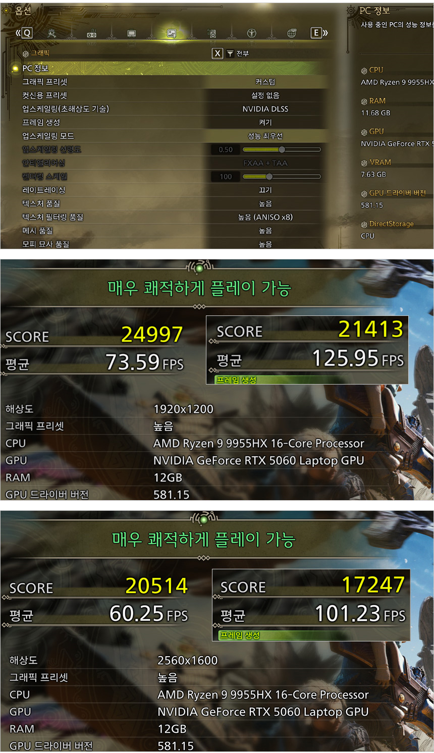 몬스터 헌터 와일드 벤치마크를 높음 옵션으로 실행한 모습으로 (VRAM 이 8GB 이하의 제품은 울트라 옵션 적용이 쉽지 않다.) 해상도에 상관없이 쾌적하게 게임을 즐길 수 있다. (DLSS를 적용하는 것을 추천한다.)