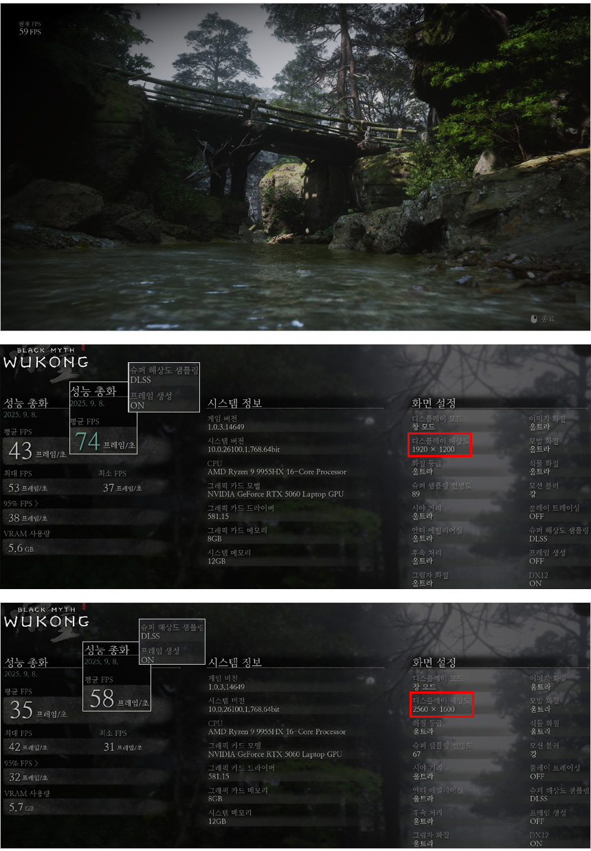 검은신화 오공 벤치마크를 울트라 옵션에서 실행한 모습으로 기본 설정에서는 프레임이 높지 않지만 DLSS를 이용해 프레임을 생성하면 성능이 높아져 더 부드럽게 게임을 즐길 수 있다.