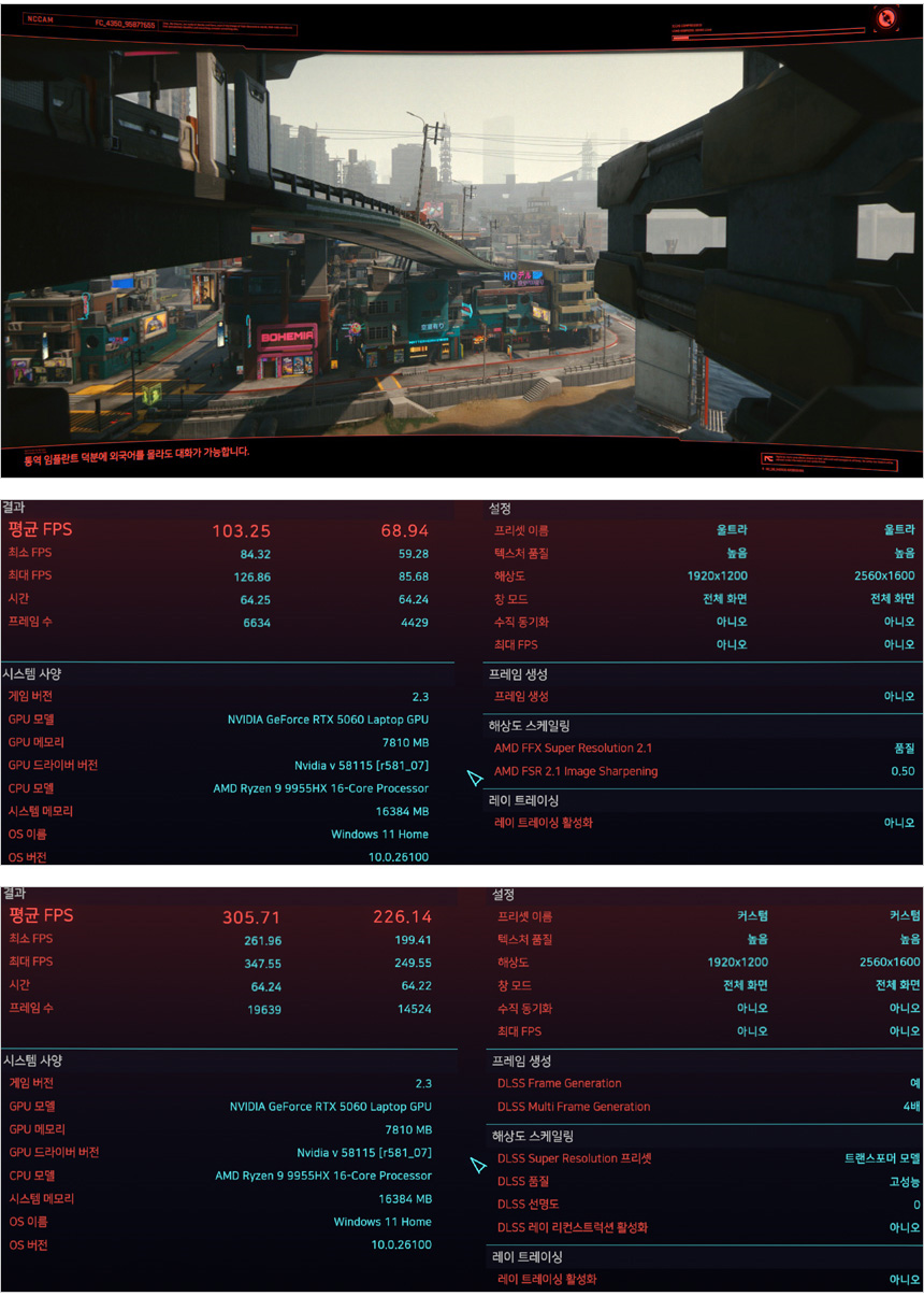 사이버펑크 2077의 벤치마크를 실행한 모습으로 다른 게임들과 같이 DLSS를 사용하면 프레임이 극적으로 향상되어 여유롭게 게임을 플레이 할 수 있다.