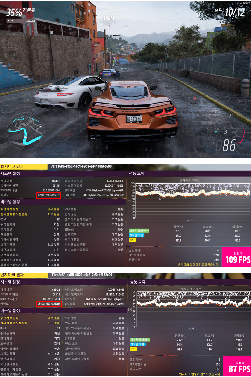 포르자 호라이즌 5를 최고 옵션으로 설정해 실행한 모습으로 WQXGA 해상도에서도 높은 프레임을 보여주었다. 해상도나 옵션에 상관없이 부드럽게 게임을 즐길 수 있을 것이다. (DLSS를 사용하면 더 부드럽게 게임을 즐길 수 있다.)