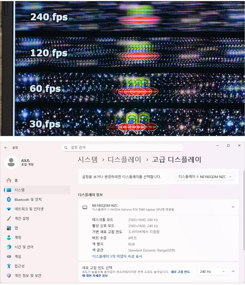240Hz 의 높은 주사율로 빠른 움직임이 필수적인 FPS 게임에서 부드러운 움직임을 경험할 수 있다. 상단의 사진은 240Hz 의 주사율을 쉽게 인지할 수 있도록 하위 프레임과 같이 재생되는 영상 (960 Pixel Per Sec) 을 셔터스피드 1/20 로 촬영한 모습으로 프레임이 낮을수록 캐릭터의 수가 적으며 프레임이 높아질수록 시간당 많은 화면이 뿌려지기 때문에 캐릭터의 수가 많은 것을 확인할 수 있다.