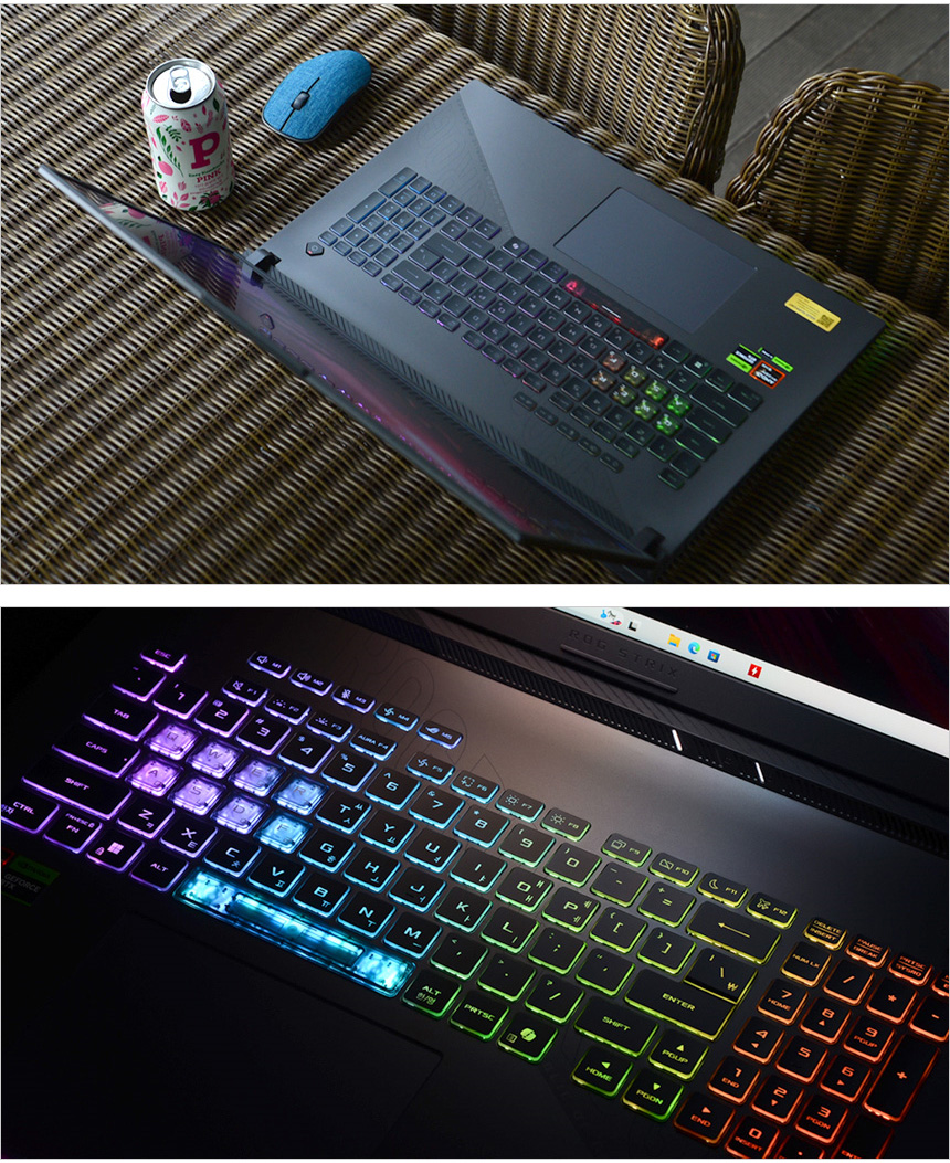 키보드의 모습으로 단색의 LED를 지원하는 일반 게이밍 노트북과 달리 RGB 백라이트 키보드가 장착되어 아름다운 조명 효과를 즐길 수 있으며 하단에 AURA 라이트 바가 설치되어 일반 노트북과는 확연히 다른 화려함을 경험할 수 있었다. (게임에서 자주 사용되는 키에는 반투명 키캡을 적용해 구분감을 높였다.) 또한 키가 눌리는 즉시 반응하는 오버 스트로크 기술이 적용되어 빠른 입력이 필수적인 게임에서 불편없이 사용할 수 있다.