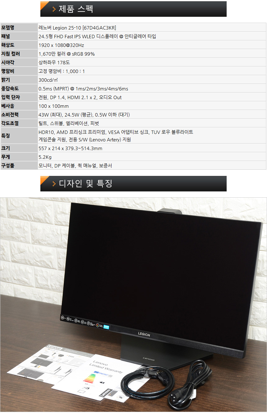이번에 리뷰를 진행 할 레노버 Legion 25-10 은 더 높은 주사율과 빠른 응답속도를 필요로 하는 게이머를 위한 최고급형 게이밍 모니터로 320Hz 주사율 지원으로 눈으로 보는듯한 부드러운 영상을 즐길 수 있으며 0.5ms 에 불과한 빠른 응답속도 지원으로 잔상으로 인한 스트레스 없이 게임에 몰입할 수 있다.