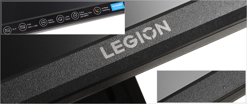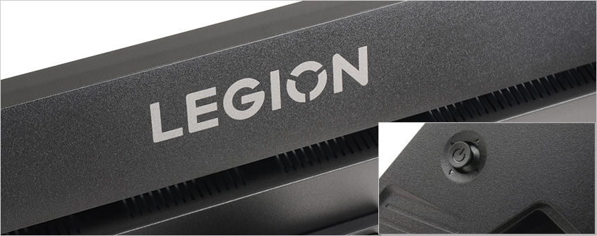 모니터 전면 하단부의 모습으로 중앙에 리전 레터링이 세겨져 있으며 측면 하단에는 LED 인디케이터가 설치된 것을 알 수 있다.