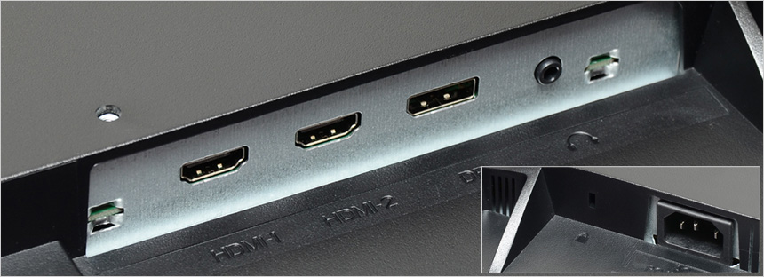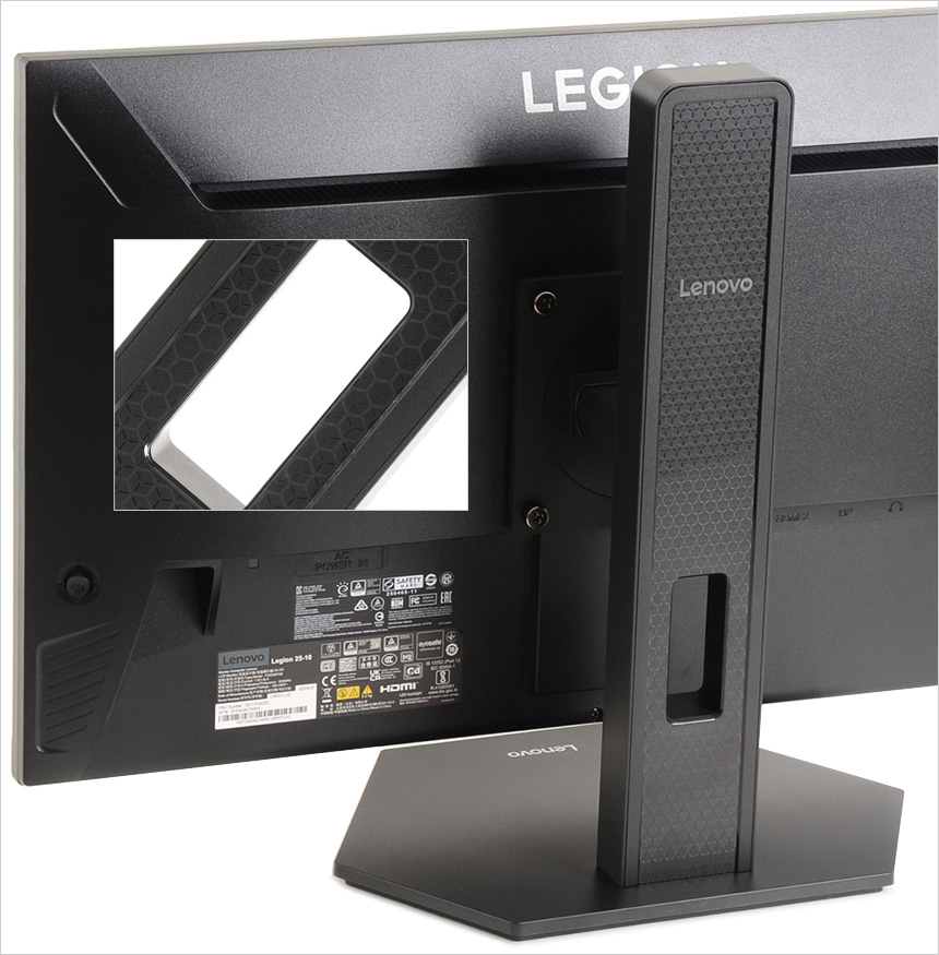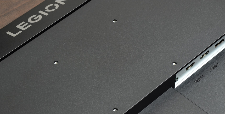 후면 중앙에는 100mm 베사홀이 설치되어 벽에 걸거나 ARM 등이 장착해 활용할 수 있으며 (4개의 손볼트가 제공되어 툴을 사용하지 않고 손쉽게 스탠드를 분리할 수 있다.) 하단에는 전원 단자와 도난 방지를 위한 시큐리티 홀이 제공된다. 또한 2개의 HDMI 2.1 단자 지원으로 다양한 디바이스와 연결할 수 있으며 PC연결을 위한 DP 1.4 단자와 스피커나 이어폰 연결을 위한 오디오 Out 단자도 지원한다.