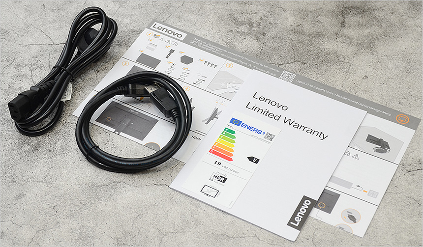 액세서리의 모습으로 전원 케이블과 DP 케이블, 퀵 매뉴얼, 보증서가 포함된 것을 확인할 수 있다.
