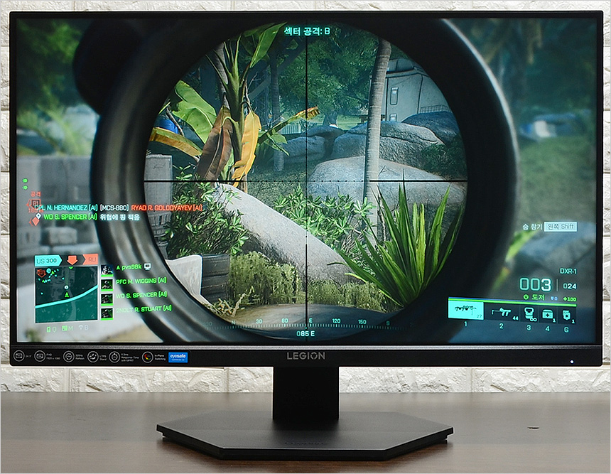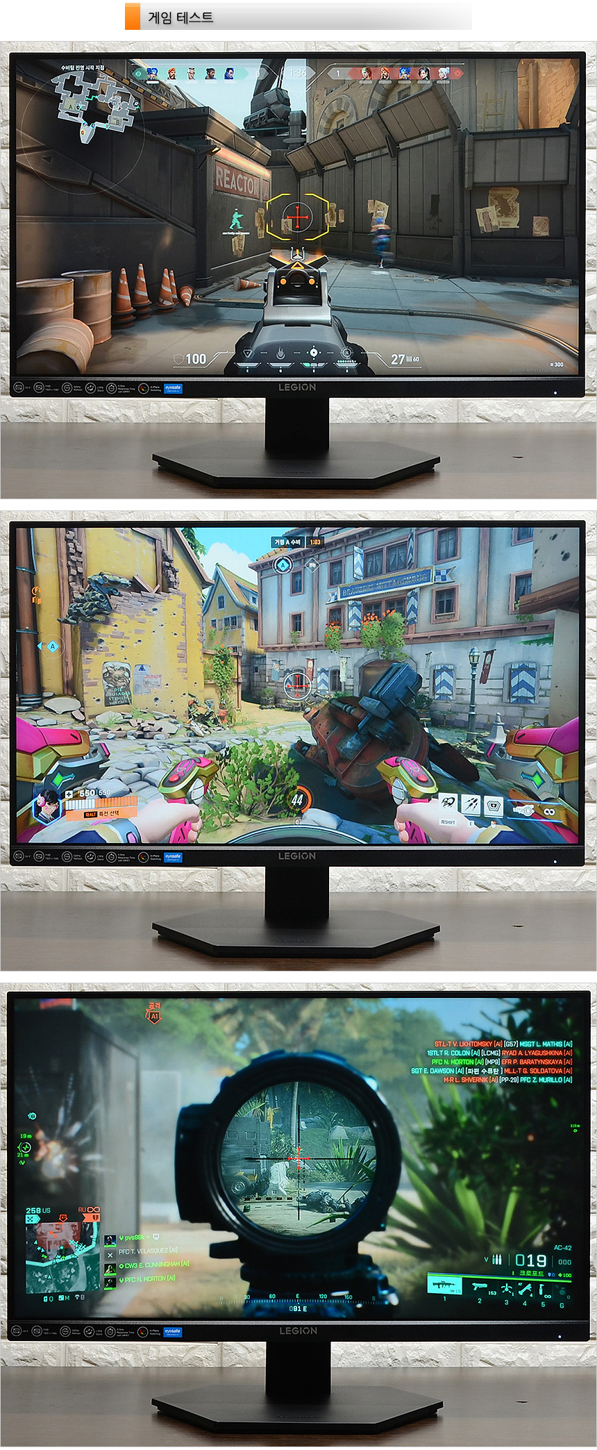 또한 조준선을 지원해 사격 정확성을 높일 수 있었으며 어댑티브 싱크를 지원해 화면찢어짐 등으로 인한 불편없이 게임에 몰입할 수 있었다. FPS1 모드와 다크부스트를 통해 시인성을 개선하니 암부에서도 캐릭터와 배경을 확연하게 구분할 수 있었다. 움직임 이나 영상의 변화를 빠르게 인지하고 반응해야 하는 FPS 게임용으로 더할나위 없는 선택이 될 것이다.