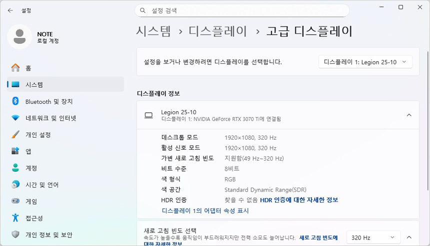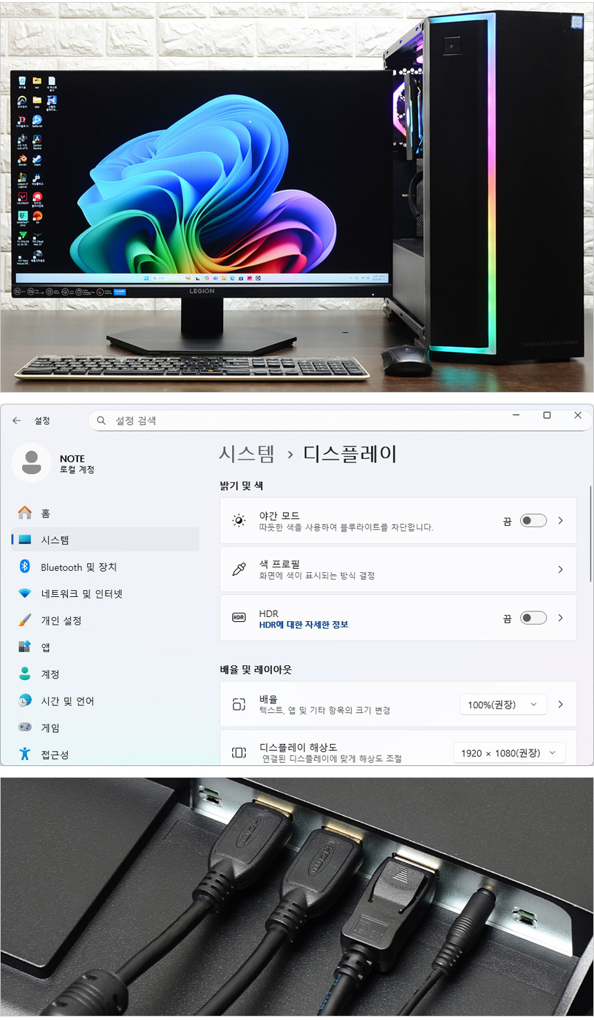 테스트를 위해 책상에 모니터와 PC를 셋팅한 모습으로 24.5형 패널을 사용해 공간을 많이 차지하지 않았다. 집이나 사무실 등의 책상이 협소하더라도 사용에 큰 어려움은 없을 것이다. 이 제품은 2개의 HDMI 단자를 지원해 PC는 물론 노트북과 게임콘솔, IPTV 등 다양한 디바이스와 연결해 활용할 수 있으며 HDR10 지원모델 답게 윈도우에서도 HDR 설정이 가능하다.