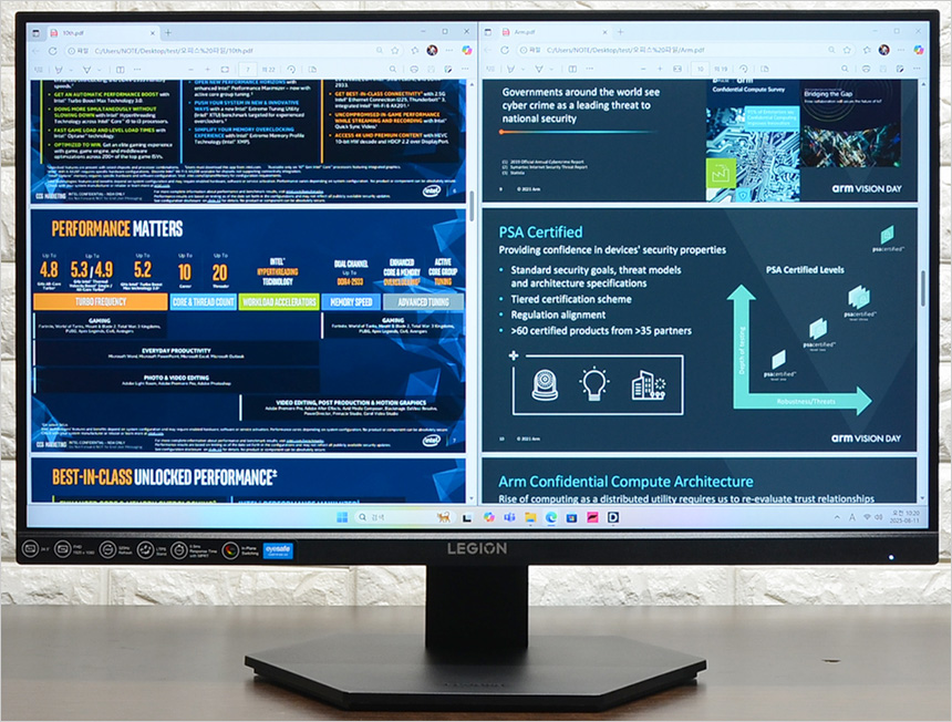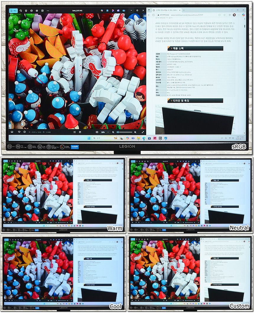화질 테스트를 진행하고 있는 모습으로 과도하게 밝기를 올려 색감을 떨어트리는 일부 게이밍 모니터와 달리 자연스럽게 색을 표현해 주었다. 이 제품은 화질에 특화된 Fast IPS 패널이 탑재되어 있고 높은 밝기를 지원하는 제품으로 게임 뿐만 아니라 동영상 감상이나 웹서핑 등 다양한 용도로 사용할 수 있다.