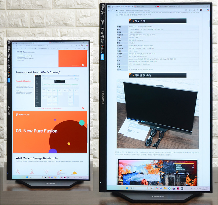 멀티스탠드 지원으로 사용성을 높인점에도 좋은 점수를 주고 싶다. 각도 조절의 한계가 있는 대부분의 모니터와 달리 사용자에 맞게 모니터 각도를 조정할 수 있었으며 피벗도 가능해 전자출판과 같은 세로에 특화된 작업도 편하게 실행할 수 있었다. (좌우 모두 돌아가도록 설계해 케이블로 인한 불편을 최소화 할 수 있었다.) 유튜브 세로영상을 즐기는 유저들이라면 특히 유용하게 사용할 수 있을 것이다.